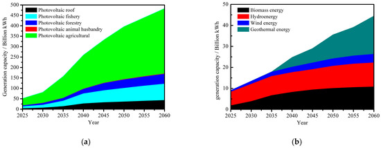 Renewable energy development forecast in rural areas of Guangdong province. (a) solar power; (b) biomass, hydropower, wind and geothermal energy generation in the province from renewable energy technology development and economic forecasts.