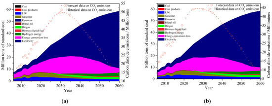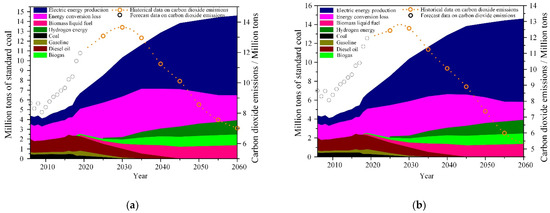 (a) Forecast under the base scenario; (b) Forecast under the radical model (From China Energy Statistics Yearbook (2007–2020) [14] and model calculation data from the State Grid Energy Research Institute.).