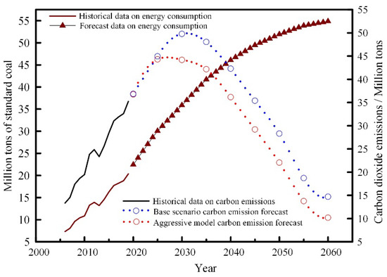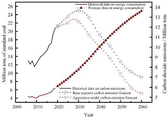 (a) Energy consumption and total carbon emissions forecast under the base scenario. (b) Forecast under the radical model.