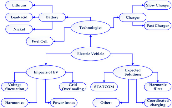 ESS is essential for bridging the time and geographical gaps between production and consumption when using intermittent RES such as solar and wind. Whether on the utility grid or in smaller, distributed networks, fluctuating generation sources generally necessitate conversion and conditioning utilizing power electronics to provide a normal alternating current (AC) demand [20]. Because of the unpredictability and fluctuation of RES, electricity storage is a crucial component of flexible smart electric networks. Bulk storage, which may release multiple megawatts over several minutes to hours, and distributed storage, which can release tens of kilowatts to several megawatts in milliseconds to minutes, are the two primary types of electricity storage. Distributed storage makes use of a wide variety of technologies, including but not limited to lead acid batteries, lithium-ion batteries, some types of flow batteries, thermal storage, flywheels, super capacitors, and hydrogen storage. BESS are taken into consideration here. Several aspects of charger used for electric vehicles (EVs) has been displayed in Figure 2.