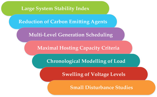 A centralized power generation system has several units for generating ample electricity integrated into an interconnected network to operate successfully. These networks can ensure the transmission and distribution of the generated power to other consumers, including private, commercial, and industrial consumers. However, these generators are linked in a decentralized system called DG topology that directly connects to the DN. In a few decades, the development of a decentralized system was modernized because fossil fuel production faced difficulties, for various reasons such as high capital costs, high grade of installation costs and transport losses, depletion rate of conventional sources and growing SG environmental challenges. Thus, the DN with a high penetration rate of RES generators has become more popular. They are interpreted differently depending on the country and the utility company. Some identify DG as “permitted for bus connection” due to its negligible impact on the electrical system, others locally as “network connected at a distribution voltage level”, while others explicitly state technical criteria such as “from a few kW to 50 MW”. Furthermore, US utilities have proposed a new criterion covering DG technologies and types through its applications. Literature studies have been listed based on objective nature as shown in Table 1.
