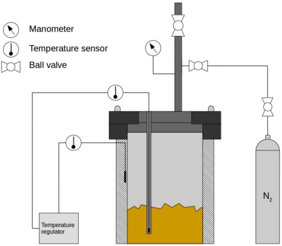 Used pretreatment reactor with temperature control unit (heating regulated by two temperature sensors), pressure release valve (on top of reactor), and attached nitrogen bottle (N2). The dashed area symbolizes heating jacket, the brown area symbolizes biomass–water mixture, the black area symbolizes the tightening clamps of the reactor, and the dark-grey area symbolizes the reactor cap (figure modified from [20]).