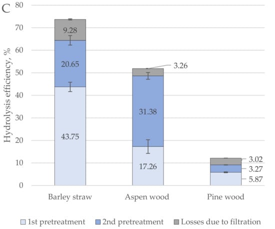 Barely straw, aspen wood, and pine wood were processed, as described in Figure 1. Figure 3 shows the hydrolysis yields for each biomass after the first and second hydrolysis. Additionally, the sugar losses after the first and third filtration are displayed. Barley straw had the highest sugar yields. The overall glucose and xylose yields with filtration losses were 29.22 g and 13.75 g per 100 g of dry biomass (DB), respectively. The overall hydrolysis efficiency was 73.69%, which is 27.09% more than what [21] achieved with a single pretreatment. Most of the glucose and xylose was released after the first hydrolysis and pretreatment at 175 °C, which means that the sugar losses were the highest after the first filtration.