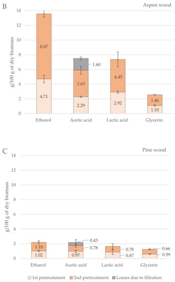 Metabolite yields for ethanol, acetic acid, lactic acid, and glycerin from barley straw (A), aspen wood (B), and pine wood (C) after seven days of fermentation. The figures also show the losses of acetic acid due to filtration after pretreatment. Each value on the graph represents the mean of one colored part of the beam. The corresponding standard deviation is shown as small bars on top of the beams. The legend on figure (C) is also used for figures (A,B).