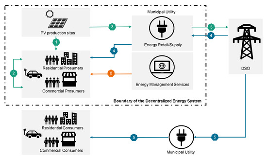 Activities and energy flows within the decentralised energy system. PV flows (in green): 1. generation and self-consumption; 2. energy sharing within the community; 3. excess feed-in to grid. Utility supply (in blue): 4. to the REC members; 5. to non-members. 6. Flexibility through demand response by shifting the timing of EV charging (in orange).