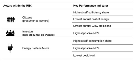The results of simulating an REC using the proposed REC Assessment Model can be interpreted in several ways. To streamline the interpretation and comparison of results, a set of key performance indicators (KPIs) are defined. Since each actor within the REC has different objectives that motivate them to participate in an REC, the KPIs that are relevant for one group of actors may not hold relevance for others. Therefore, the KPIs that are most relevant to each group of actors are identified.