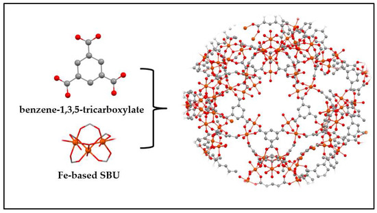 Crystal structure of MIL100(Fe) from the reaction between the benzene-1,3,5-tricarboxylate and the iron(III)-based cluster.