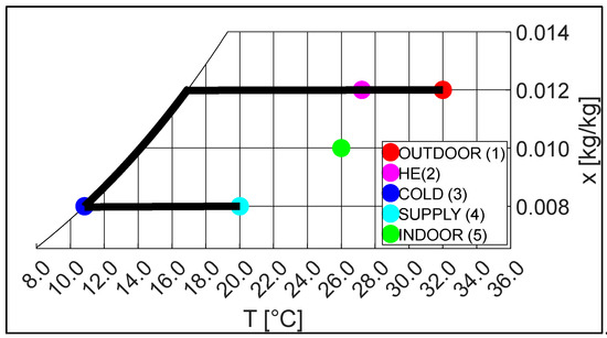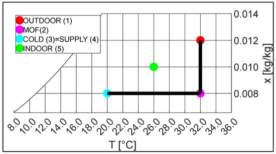 In a HVAC system with MOF-assisted dehumidification (Figure 4), the dehumidification process is operated by a device that connects the outdoor airflow with the MOF material, ensuring an isothermal transformation. In the system, the outdoor airflow undergoes the following transformations: