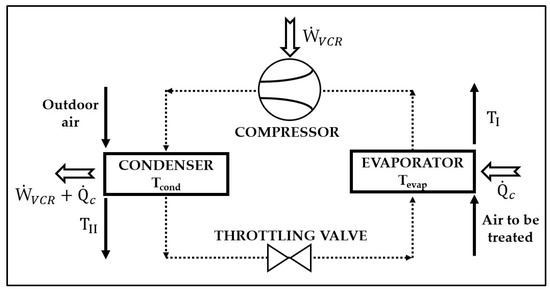 To evaluate the electric power consumption of the VCR cycle, associated with the activation of the cooling coil, the temperature levels of the coolant must be considered. They are set by the air temperature conditions at the cooling coil (evaporator) and at the condenser, and by opportune temperature differences between coolant and air (Figure 6). For the evaporator, the outlet air temperature is known (TI, equal to Tc in this context), consequently the evaporation temperature; for the condenser, an outlet condensing air temperature is fixed (TII), consequently the condensation temperature. The temperature differences at the evaporator and the condenser ( and ) are defined, taking into account common efficiencies for these kinds of heat exchangers: