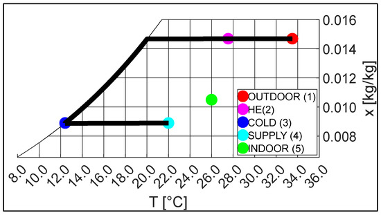 In the following, a simplified mathematical model used for the evaluation of the different psychrometric transformations is shown. The supply airflow is formed completely by outdoor air. The supply conditions, in terms of temperature and humidity ratio, are defined as follows: