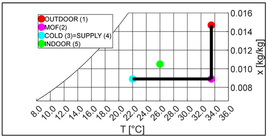 At the MOF device, the outdoor air undergoes isothermal dehumidification down to the supply humidity ratio.