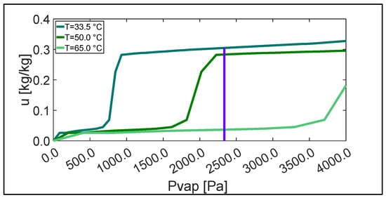 It is possible to note that MOF material shows the best performance of water uptake at these conditions (0.48 kg/kg against 0.24 kg/kg of silica-gel and 0.30 kg/kg of zeolite). This means that, for the same used quantity of adsorbent material and the same boundary conditions, MOF material achieves a better dehumidification result (i.e., amount of water vapour adsorbed). These results are representative of a typical situation in which air dehumidification is required. Generally speaking, MOF materials have a favourable isotherm, so they are strongly effective, in the range of sufficiently high values of RH that otherwise would request an overload on the cooling device (e.g., low coolant temperatures) for the dehumidification process. Regarding the regeneration capacity, it is useful to compare in the graphs the temperatures required to obtain a value of uptake close to zero. MIL-100 presents, compared to the other options, a low regeneration temperature to remove the uptake water content from the material and restore its adsorption capacity. It is vital to remark that this temperature is well coupled with the conditions of the VCR condenser (low-grade thermal energy), while additional heat sources are requested for the other desiccants (as it is possible to observe from Figure 9, Figure 10 and Figure 11).