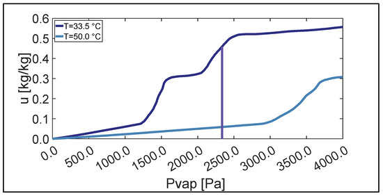 In each graph (Figure 9, Figure 10 and Figure 11), the isotherms corresponding to the adsorption (To = 33.5 °C of case B) and typical regeneration temperatures are reported. For silica-gel and zeolite the isotherm associated with the temperature of the air exiting the condenser of VCR (TII) is shown, to make an easy comparison with MOF material.