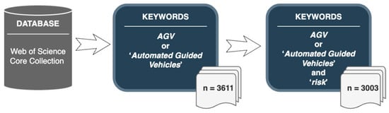 In the identification step, the Web of Science Core Collection (WoS CC) was chosen as the database for this study. This limitation of the study to the Web of Science database was intentional. The publishers accepted for analysis at a later stage of the selection index their publications in the WoS CC and Scopus databases simultaneously. For this reason, the search procedure conducted in the Scopus database with the same limitations did not significantly affect the number and type of publications accepted for further analysis. The keywords for the search were defined as “AGV” or “automated guided vehicles”. This selection criterion allowed for the finding (as of 30 September 2022) of 3611 documents. The main search has been refined for the current review by adding the attribute “risk” to the search criteria. After the first stage of the PRISMA framework, 3003 documents were extracted. The identification stage is fully shown in Figure 1.