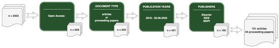 The leading publisher is MDPI, which published 44% of the papers considered in this study. The advantage of MDPI is significant and results from the fact that this publishing house has the shortest publication cycle. Authors are eager to publish with MDPI because their research concerns current scientific trends responding to the needs of the industry. It should also be noted that the dominant share of this publishing house may result from the fact that all titles published by it are open access. It is further worth emphasizing that the documents published by MDPI include only peer-reviewed articles. The other two publishers produced 30% (Elsevier) and 26% (IEEE) of the papers considered. In the case of these publishing houses, not all articles are available in open access, which may have resulted in their lower share of the analyzed publications. Documents published in Elsevier and IEEE include collections of peer-reviewed articles and conference papers. Quantitative data on the leading publishers are presented in Table 1.