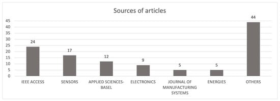 The leading journals are IEEE Access, Sensors, Applied Sciences-Basel, Electronics, Journal of Manufacturing Systems, and Energies. A total of 62% of the analyzed articles were published in them. The number of articles published in individual journals is presented in Figure 5.
