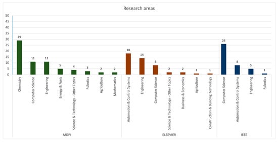 Figure 7 shows divisions created by publishers and research areas. As can be seen, all of the publications distinguished in the area of Chemistry were published in MDPI. On the other hand, Automation and Control Systems articles were published mainly by Elsevier and IEEE. All three publishers widely publish in the other two leading research areas (Computer Science and Engineering).