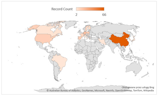 In the analysis, the most dominant country in the field of AGV research is China, which wrote 30% of the articles. Next are Germany (13%) and Poland (10%). Few studies are conducted in South America, Eastern Europe, and most Asian countries. Scientific contribution by country and geographic region is shown in Figure 8.