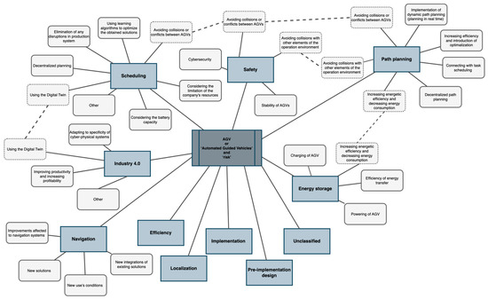 The largest subcategory is the area related to the use of the Digital Twin in improving the functioning of the AGV system. The Digital Twin is used in this case to improve AGV navigation [], to control the movement of vehicles in the production hall [,], to improve the AGV work schedule [], to test the working environment of the vehicles [], and in the broadly understood improvement of AGV system management [].