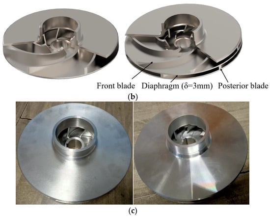 The impeller blades of the original model pump are divided into half along the middle axis section, cut to form the front layer blades and the rear layer blades. The best effect of reducing pressure pulsation in double suction pump when blades are evenly staggered [6,7], so the two layers of blades are staggered by 30°. The two−layer blades are divided and connected by the middle partition plate. After the strength check, the thickness of the two−layer blade connecting the partition plate is δ = 3 mm. Because the flow passage area of the low specific speed centrifugal pump impeller is relatively small, after the blades are staggered in half, the flow passage area in the front and rear layers of the staggered impeller is reduced. Therefore, considering the flow channel area and improving the inlet inflow of the staggered impeller, the inner diameter of the connecting baffle is set to φ = 90 mm. as shown in Figure 1a. The original impeller and staggered impeller are shown in Figure 1b. In order to accurately obtain the characteristics of the centrifugal pump with different impeller models, the impeller parts are processed by five−axis numerical milling, and the experimental impeller is shown in Figure 1c.