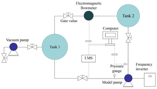 The hydraulic performance and pressure pulsation characteristics tests of the centrifugal pump are carried out in the DN150 pump closed test bench. The test bench is shown in Figure 2. The water temperature is maintained at around 25° throughout the test. The electromagnetic flowmeter was used to obtain the model pump flow under different working conditions, and its measurement accuracy was ±0.2%. The flow of the model pump can be adjusted by a valve installed at the inlet of the tank. The pressure measurement error of the model pump is ±0.075%. An AC frequency conversion cabinet controls the motor used in the model pump, and its speed is stabilized at the rated value of n = 1450 rpm.