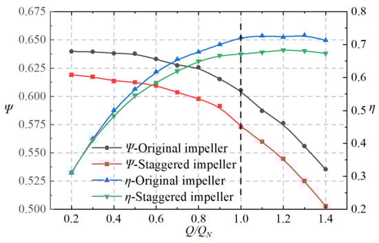 The comparison diagram of the head coefficient and efficiency of pumps with two impeller models under experimental measurement is given in Figure 4. The results show that the head coefficient of the staggered impeller model pump decreases at all measured conditions. From the comparison of efficiency curves, it can be found that the efficiency difference in the staggered impeller model is slight under minor flow conditions (0.2QN–0.5QN), and the efficiency decrease is noticeable under large flow conditions (1.0QN–1.4QN). Table 2 shows the drop range of the head coefficient and the efficiency of the staggered impeller model pump under 1.0QN, in which the head coefficient decreases by 5.29% and efficiency decreases by 5.60%. The clapboard connects the staggered blades. Compared with the original impeller, the inflow liquid moves to the back of the blade under the work of the blade, and the inflow impact at the baffle after the liquid enters the staggered impeller is large. After impacting the clapboard, it flows into the front and rear impellers respectively, which is easy to interact with the liquid that obtains the working energy of the blade. The diffusion in the flow channel is disordered, the theoretical diffusion angle is halved, and the diffusion loss increases. At the same time, when staggered blades squeeze the liquid, the friction loss between the two sides of the blade and the partition is much larger than that of the original impeller, weakening the working ability of the impeller, resulting in a decreased in the performance of the pump. Overall, the staggered impeller affects the pump’s operating curve, which reduces the head and efficiency to a certain extent. Therefore, from a performance perspective, staggered impellers do not have advantages when designing a centrifugal pump. The following section will analyze whether staggered impellers have advantages from the perspective of pressure pulsation signals.