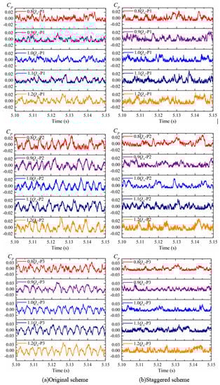 Five main operating conditions from 0.8QN to 1.2QN are selected to analyze the pressure pulsation characteristics. In a centrifugal pump, the high−energy pressure pulsation caused by the RSI between the impeller and the tongue is the primary source of flow−induced vibration. Therefore, this paper analyzes the distribution characteristics of pressure pulsation near the tongue. Figure 5 shows the time domain distribution of pressure pulsation under different working conditions at three pressure pulsation measuring points (P1, P2, P3) near the tongue of different schemes. Studies have shown that the unsteady flow at point P2 (near the tongue) is complex, and the pressure pulsation signals are composed of many components [3,24]. The time domain result shown in Figure 5 is the instantaneous data collected after a period of stable operation of the pump. The sampling time is greater than one impeller rotation cycle, and the data is dimensionless. It can be found that there are apparent differences in the distribution of the time domain signal characteristics of the three measuring points from the test results. In the original impeller scheme, the pressure pulsation of each measuring point is the most stable under the design flow condition. The pressure pulsation has a certain regularity under the off−design flow condition. However, in the 0.8QN and 1.2QN working flow conditions, the pulsation peaks and troughs amplitude values are obviously inconsistent. In the staggered impeller scheme, the pressure pulsation amplitudes under the given conditions are smaller than those of the original impeller scheme, and the pulsation peaks and troughs are dense. In the same sampling time, the number of peaks and troughs increases in the staggered impeller scheme.