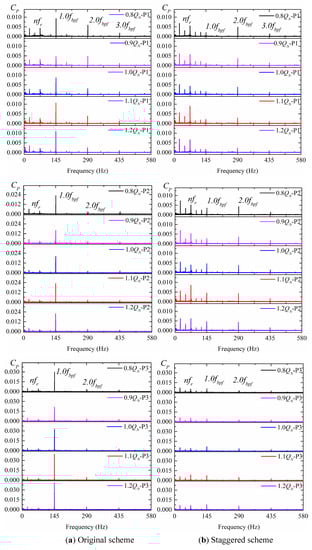 In order to further analyze the frequency domain characteristics of pressure pulsation under different working flow conditions of three monitoring points, FFT transformation is performed on the pressure pulsation signal. Figure 6 shows pressure pulsation’s frequency domain distribution characteristics under different flow working conditions at three measuring points of different schemes. The number of blades in the original impeller model pump is six. In the frequency domain, the peak value is six times the axial frequency, that is, the main frequency is the impeller passing frequency. After the blades are staggered, the number of impeller tongue interferences is doubled. The twelve blades in the staggered impeller interfere with the tongue, and the main frequency becomes twelve times the axial frequency, that is, twice times the blade frequency. It can be seen from Figure 6 that the amplitudes of the characteristic frequency of each measuring point under different flow working conditions are pretty different, and the primary characteristic frequency is the blade passing frequency (fbpf = 145 Hz) and its higher harmonics. Especially at P1, the amplitude of the 2fbpf has the most significant variation with the working flow conditions. It can be found that the primary characteristic frequency of the staggered scheme is 2fbpf under different flow working conditions at the same measuring point, and the fbpf amplitude is almost completely suppressed, especially at P3. The characteristic frequency amplitude of point P3 sharply increases under the development of RSI, while the characteristic frequency amplitude is almost completely suppressed in the staggered impeller scheme. This remarkable effect is brought about by the phase difference between the front and rear impellers, and the tongue separation after the blades are staggered. The vibration noise caused by hydraulic excitation in the pump system mainly comes from RSI. After the blades are staggered, the outflow of the two layers of impellers interferes with the tongue respectively, resulting in a phase difference in the vibration waveform. After superposition, the vibration energy is greatly reduced. Therefore, we can see the waveform with small amplitude and dense amplitude in the time domain diagram, and the amplitude energy of the characteristic frequency is also greatly reduced. This is also an effective means to suppress the source of pump vibration and noise.