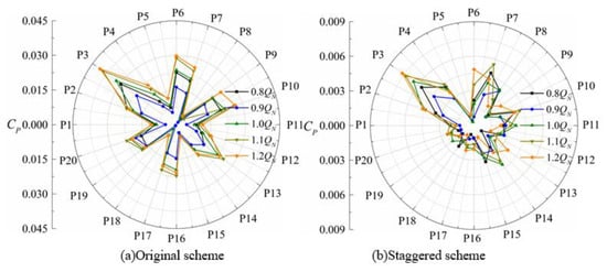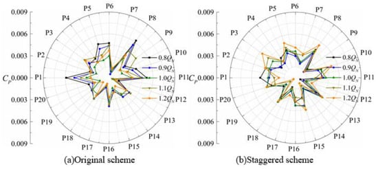 In order to analyze the influence on the overall pressure pulsation characteristics of the staggered impellers, the amplitude values of fbpf at 20 measuring points mounted on the volute are extracted in Figure 7. The figure shows that the amplitude of fbpf in the original scheme presents six peaks and troughs, while the magnitude of the amplitude of fbpf is significantly reduced after the impeller is staggered, so that its value is too small to show the number of regular peaks. The amplitudes of the two schemes at fbpf are the highest at point P3, which is downstream of the tongue. The amplitude of fbpf in the staggered scheme is significantly reduced, and all the measured values of the 20 measuring points are smaller than in the original scheme. The distribution characteristics of the amplitude of each measuring point under different working flow conditions are similar. As the flow rate increases, the amplitude of fbpf first decreases and then increases, and it is the lowest at the design flow condition.
