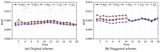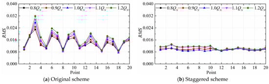 The previous analysis shows that the high-frequency band has almost no high−amplitude excitation frequency. Therefore, the signal in the frequency band of 4fbpf = 580 Hz is selected for the RMS analysis of pressure pulsation energy. In the frequency spectrum of the two impeller schemes, fr and its high harmonic frequency signal are captured. Therefore, Figure 9 firstly shows the pressure pulsation energy at each monitoring point in the 0–fbpf frequency band under 0.8QN–1.2QN. This frequency band includes multiple low−frequency signals, which are nfr (n = 1, 2, 3, 4, 5). In the original impeller scheme (Figure 9a), the pressure pulsation energy under each working flow condition is stable in the 0–fr frequency band, and the pressure pulsation energy of the P1−P20 measuring points shows a trend of first increasing and then decreasing. The pressure pulsation energy of 0.8QN–0.9QN is obviously higher than that of 1.0QN–1.2QN. It can be proved that the shaft frequency pulsation energy is larger under the small flow rate. It can be seen from Figure 9b that, compared with the original impeller scheme, the monitoring points at the upstream and downstream of the tongue in the staggered impeller scheme have a larger difference in pressure pulsation energy under the partial working conditions. The RSI between the staggered blades and the tongue strengthens the amplitude energy at 0–fbpf, so the pressure pulsation energy with the staggered impeller scheme is higher in this frequency band.