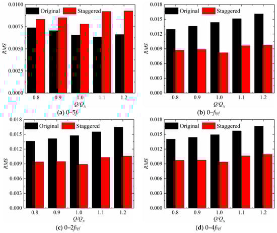 Figure 11 compares RMS average values in different frequency bands under the two schemes from 0.8QN to 1.2QN, further showing more details of the pressure pulsation energy distribution under different working conditions. It can be seen from Figure 11a that in the frequency band of 0–5fr, the pressure pulsation energy of the staggered impeller scheme is higher than that of the original impeller scheme under 0.8QN–1.2QN. At the same time, the nfr signal excitation source has been strengthened under 1.1QN–1.2QN. It can be seen from Figure 11b–d that the nfbpf signal is included in the other frequency bands, and the pressure pulsation energy of the staggered impeller scheme is smaller than that of the original impeller scheme. With the expansion of the frequency band, the energy suppression effect of the staggered schemes under five working conditions is gradually stable. In general, the staggered impeller scheme significantly inhibits the pressure pulsation energy in the pump.
