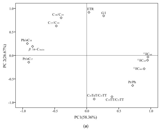 In fact, one of the advantages of PCA is that nearly every result can be represented graphically. Through calculating the principal component values of each sample (the detailed procedures of calculation may refer to Wang and Ma, 2018), the loading and score plots of PC1 vs. PC2 are obtained. By comparing the loading and score plots, the geochemical parameters responsible for groupings become apparent. As shown in Figure 3a,b, the studied oil samples in the eastern Fukang Sag can be easily classified into three families: Family C oils have high positive values for PC2, meaning that they have the highest ETR and GI values and the lowest C24TeT/C23TT value. Oils from Families A and B have mostly negative values for PC2, but Family B oils have positive values for PC1, meaning that they have high C19TT/C23TT and Pr/Ph ratios and heavy carbon isotope values (δ13Coil, δ13Csat, and δ13Caro), whereas Family A oils have negative values for PC1, and this indicates that they have the highest Pr/nC17, Ph/nC18, β/n-Cmain, C27/C29, and C28/C29 ratios. It can therefore be expected that PC1 is sensitive to sources of organic matter.