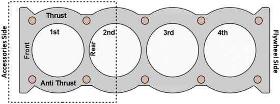The simulation in this research followed the model validated by Alshwawra et al. [14]. The model focused on the first and half of the second cylinder to capture the different thermal loads generated by adjacent cylinders and their surroundings. It is expected that the deformation of the first and fourth cylinder liners would be more complicated and asymmetric than that of the second or third cylinder liner due to the asymmetric thermal load [12]. The first and half of the second cylinders are shown in Figure 1 as well as their positions in the engine.