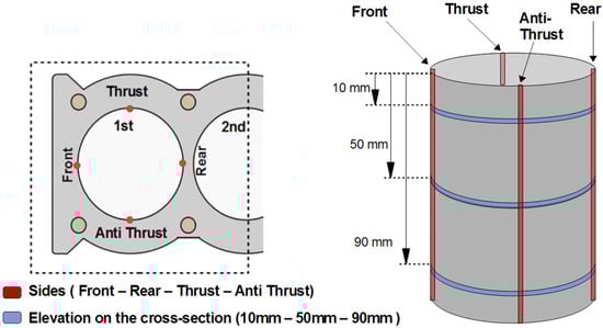 This figure illustrates the circumferential deformations at the different main elevations of the cylinder liner (10, 50, and 90 mm). Due to the observed differences in radius between the elevation layers, the bore deformation along the elevation was studied. The investigation of the bore deformation plays an important role in obtaining a comprehensive description of the deformations of the additively manufactured liners. As observed previously, the greatest deformation in the cylinder liners occurs on the four main sides (thrust, anti-thrust, front, and rear). These four sides were therefore selected for investigation, as shown in Figure 5.