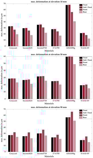 A variety of methods were used to assess the compatibility of additive manufacturing materials for the cylinder liner. As a starting point, the maximum deformation method was used, since it is the simplest method to study the influence of different materials on the structural behavior of the liner. Data can be collected directly from the ANSYS interface, which shows an overview of the direction and the amplitude of liner deformations. The deformations in the Z direction are very small compared to the deformations in the XY plane; thus, the maximum deformation in the Z direction can be ignored and the comparison is only conducted in the XY plane. The maximum deformation at the three mentioned depths is depicted in Figure 3.