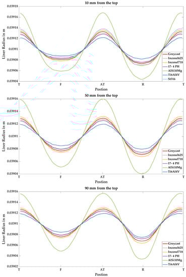 AlSi10Mg has a significantly higher change in radius than the other materials. There is a difference of 60–70 µm between the ideal shape radius (0.0391 m) and the radius on the four main sides of the liners (thrust, anti-thrust, front, and rear). The radius of the Ti6Al4V alloy liner was the closest to the non-deformed liner. Other additive manufactured materials showed different deformation behaviors. Inconel625 and 17-4PH show a slight improvement in the radius curve compared to the grey cast iron.
