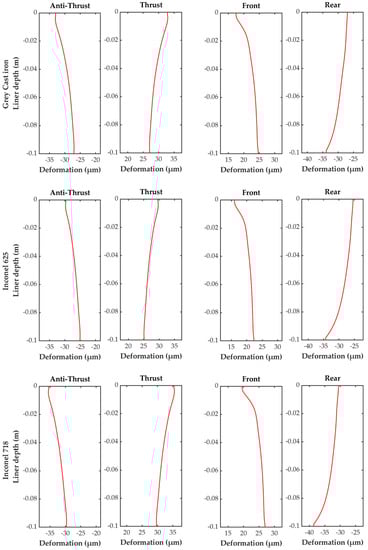 The deformation of the liner was simulated at three different depths from the top deck, as well as 10, 50 and 90 mm. The analysis considered front, rear, thrust and anti-thrust sides as shown in Figure 2.