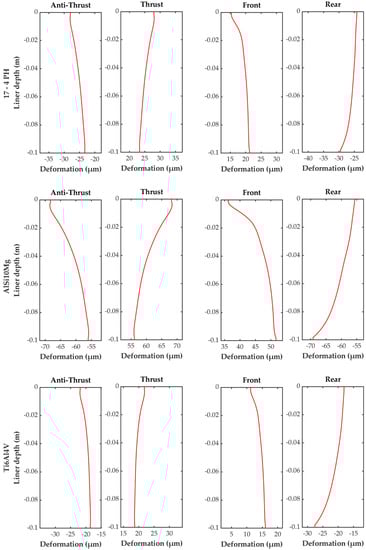 It is apparent in Figure 5 that deformation varies from side to side. There is usually more deformation in the upper part than in the lower part. Inconel625, 17-4P, Ti6Al4V and Inconel718 have a very similar bore deformation trend similar to the grey cast iron. These liners were deformed into a conical shape in the thrust–anti-thrust direction. The difference in deformation on the thrust and anti-thrust was less than 5 µm. In the case of AlSi10Mg, the bore deformation looked different. The top part was even more deformed than the other materials. There could have been a difference of up to 15 µm, and the shape remained conical.