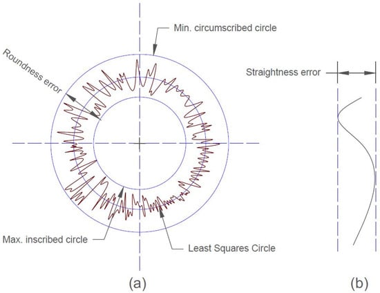 In order to determine whether additive manufactured materials affect the roundness of the liner’s cross-section, the roundness errors were calculated at different elevations (10, 50, and 90 mm) using the least squares circle (LSC) method. In this method, a specific center point of the circle is set in such a way that the sum of the squares of the deviation is minimized for the measured profile. The inscribed circle and the circumscribed circle are drawn next. The roundness error ΔR is the difference between the radius of the inscribed circle and the radius of the circumscribed circle as shown in Figure 6a.