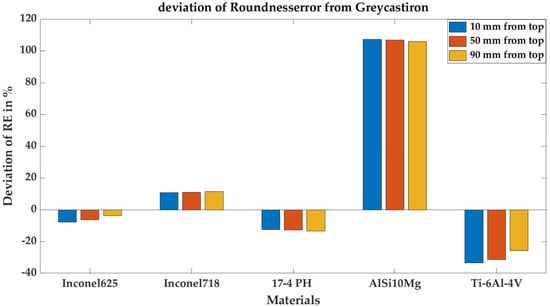 Materials such as Ti6Al4V and 17-4PH have a significant improvement in roundness compared to grey cast iron. With an approximate roundness error of 39 µm, Ti6Al4V had the lowest roundness error. The two Inconel materials show different performances. While Inconel 625 had better roundness values than grey cast iron, the roundness error was greater for Inconel 718 than for grey cast iron. AlSi10Mg had about a 120 µm roundness error, which is very high compared to the grey cast iron. A larger roundness error implies that the piston rings need increased pretension to prevent leakage. This increases the frictional losses to a certain extent [1]; therefore, the friction with AlSi10Mg could increase compared to the grey cast iron. In contrast, friction can be reduced when Ti6Al4V and 17-4PH materials are used.