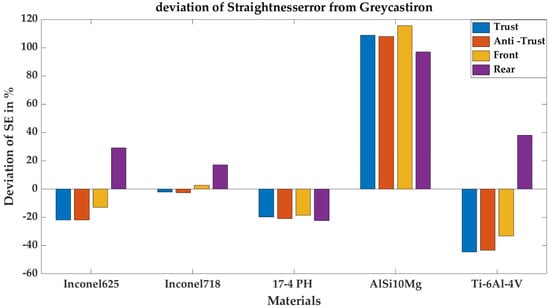 Table 4 shows the straightness error of the six liners (five AM materials and grey cast iron), while Figure 8 shows a deviation in the straightness error (SE) of the AM materials from the straightness error of the grey cast iron. Note that there was no straightness error in the cold state. The table shows that Ti6Al4V had the best and smallest straightness error between all material alloys but not from all sides. On the rear side, the straightness error value (9.5 µm) was higher than the value for the reference material. The straightness error with Inconel625 on the rear also had a higher value compared with grey cast iron. Again, AlSi10Mg had the largest straightness error on both sides: front and rear (15.5 and 13.5 µm). In general, the ranking from this analysis remains the same as for the elevation of the roundness error.