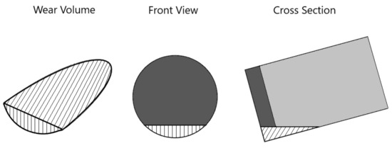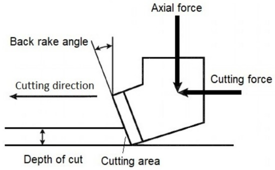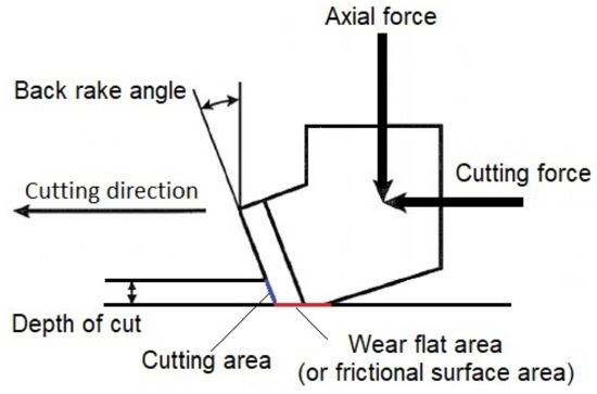 A back-rake angle is represented by in these equations. It is the angle between the cutter face and the vertical axis. The is the area of contact between the cutting face and the rock. It is dependent on the depth of penetration as illustrated in Figure 1 and Figure 2. The wear area below the cutter is demonstrated by . The area beneath the cutter is believed to be zero when the cutter is new, and once the cutter begins to wear, the friction forces applied by this surface contribute to the cutting force. When the increases, the depth of cutting decreases assuming constant cutting and normal forces are applied. As stated previously, K is the rock drillability, which depends on the physical properties of the rock (porosity and permeability), lithology, the module of elasticity and Poisson’s ratio. The is the confining pressure applied during rock cutting. The confining pressure is the difference between the equivalent circulation pressure and the pore pressure in an actual drilling operation. The stands for the height of the cutter that is worn during the cutting process. It may be possible to relate this wear height to the wear area below the cutter, while the chamfer angle should be taken into account when transforming geometrically.