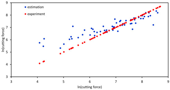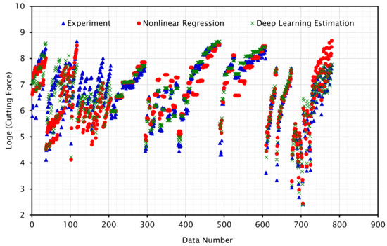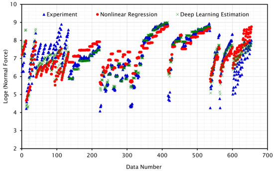 Based on the k-fold cross validation, Figure 3 shows the result for test data by the deep learning network that was trained from the training set of data. The x-axis represents the values from experiments, while the y-axis represents the correlation values. Actually, force values from the experiment are plotted against themselves (red dots) to provide a basis for comparison with correlation values. The blue dots in this plot correspond to the estimated values, which demonstrates an acceptable fit of the data as well as the performance of the deep learning algorithm and network.