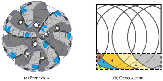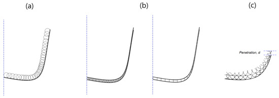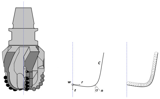 In order to continuously evaluate the dynamics of the PDC bits during drilling, a reference time and depth should be established in order to average drilling parameters and evaluate objective parameters (forces on cutters, torque, and specific energy). Dynamic and kinematic drilling variables can be averaged using the revolution of the bit [25]. In essence, the idea is to calculate the net effect of all cutters on the bit that drills depth d per revolution by averaging them. PDC bits have been the subject of a number of experimental and theoretical studies aimed at simulating their condition and behavior with regard to the cutter state and their role in drilling [2,3,15,20]. Since such models are modeled individually, geometric modeling and implementation are complex as each cutter is responsible for drilling as well as being subjected to both tangential and normal forces. It is possible to construct equivalent blades (imitating the cross section of a bit profile) from cutter traces in order to accommodate the complexity of modeling geometrical features and the inclusion of real-time drilling data, as illustrated in Figure 5. The idea of making an equivalent blade has been proposed by some researchers [3,4,25]. The equivalent blade is constructed by taking the trace of all cutters in one revolution on a vertical plane containing the bit axis (Figure 6).