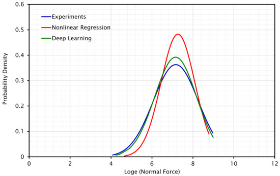 To perform regression, different optimization techniques were used, such as the genetic algorithm, deep learning, particle swarm optimization, and function of MATLAB. The scope of all these techniques was to minimize the objective function defined in Equation (3). It is the sum of the difference between the force measured during experiments, , and the calculated values from correlations, ; however, the difference value for each data point is normalized using the experiment data. Using the techniques, the objective was to minimize the difference between the measured and calculated values, so a minimization algorithm was employed. Constrained optimization was performed based on the upper and lower bounds and the output solution for the objective function is valid for these intervals. Optimization of the objective function resulted in R-squared values (coefficient of determination of the percentage of variation in dependent variables explained by the regression) of and for normal and cutting forces, respectively. Further details about the regression are provided in Table 6 and Table 7. R-square is a measure of the exactness of the regression, but F-factor presents a hypothesis test for the entire regression. This test indicates how strongly the dependent variable is related to the independent parameters. Here the critical F values for the normal and cutting forces based on the degree of freedom are equal to while F values from the regression are and for normal and cutting forces, respectively. The comparison of critical F values with values from the regression indicates that there exists a hypothesis that confirms a relationship between force values and the independent cutter, rock, and operational (confining pressure) parameters.