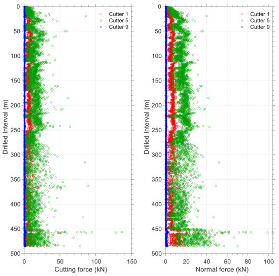Considering the influence of each cutter on the overall performance of the PDC bit is the most advantageous, but also the most complex method of modeling the performance of a PDC bit. It is possible to model and evaluate the efficiency of any PDC bit using a general model of forces acting on cutters, as well as the part of the dynamics of the drill string that is related to the drilling bit. An experimental model was developed by Glowka [2,3] based on a single cutter analysis under atmospheric conditions in order to describe the cutting process of PDC bits. The results were analyzed to provide equations relating force on the cutter to rock type, cut depth, and cutter wear. This was followed by implementing a model for evaluating the performance and wear of PDC bits [3]. Liang et al. [43] developed an equation to estimate the cutting and normal force on cutters based on experimental data regarding cutting area, rock drillability, back-rake angle, cutter wear height, and arc length coefficient.
