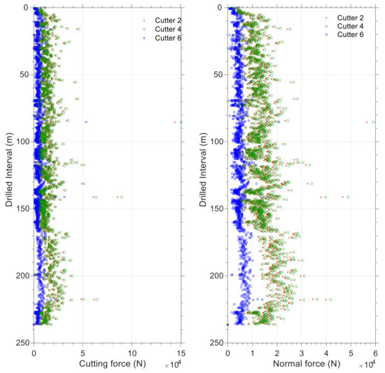 The novelty of the present study is that it develops two equations to estimate normal force, , (force that is parallel to the axis of the bit) and cutting force, , (force perpendicular to the axis of the bit and in the direction of movement of the cutters) considering all design, operational, and rock parameters. In this context, the design specifications of a PDC bit include cutter diameter, back-rake angle, and in-built wear flat area; operational factors comprise confining pressure at the bottom of the hole and rate of penetration; and rock parameter is characterized as drillability. In this study, experimental data from the literature are collected and analyzed using nonlinear regression algorithms. Thereafter, these equations were integrated into the bit and cutter models so that they could be related to weights and torques on the bit. A recursive least squares technique is used to handle real-time measurements for the purpose of studying the dynamics of the drill string and bit in real time. The remainder of this research paper is organized as follows. The first part of this paper is devoted to the development of mathematical equations for cutter–rock interaction. A description of the approach for studying the dynamics of drilling is provided in the second part. In this section, we discuss specific energy and how measurements are linked to developed models using data analytics. We conclude our paper with the results and discussion of two case studies (two bit runs in a inch section) from the Norwegian continental shelf.