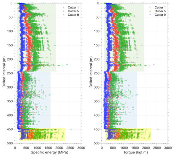 Specific energy (left) and torque (right) plots for the bit run number 2 for three equivalent cutters; i.e., 1, 5, and 9.