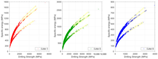 The results of torque and specific energy analysis in equivalent cutters for two bit runs are presented in Figure 17 and Figure 18. Taking into consideration the position of the equivalent cutters, all exhibit similar trends, but their specific energy and torque values differ. Similarly, the torque in all equivalent cutters (here equivalent cutters 1, 5, and 9 for bit number 1 and equivalent cutters 2, 4, and 6 for bit number 2) follows the same trend as the cutting force in Figure 15 and Figure 16. On the basis of Equation (10) and the rate of penetration data, specific energy is calculated at equivalent cutters. Based on the simulated data for bit run number 1, three distinct trends can be identified. It is significant to note that each of these trends represents variations in the downhole parameters or drilling dynamics. They could, for example, be related to changes in rock drillability or variations in downhole differential pressure. As a result, by measuring the annulus pressure near the drilling bit, it is possible to link such variations to rock drillability with a high degree of precision. The plots of specific energy versus drilling strength for both bit runs are shown in Figure 19 and Figure 20. It has been found that three trends are derived in Figure 19, which correspond to the trends in Figure 17. As there is no change in downhole pressure as a result of fluid loss or influx, these variations are caused by changes in the drillability of the rock. The interval for the second bit run has almost constant lithology, and therefore there is a single trend in the plots for specific energy and drilling strength.