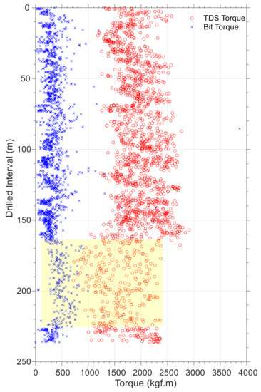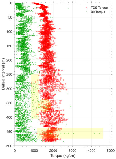 As there is no near-bit ASM sensor to measure the torque at the bit, having a cutter–rock interaction model provides an opportunity to scale up forces at equivalent cutters in order to calculate the torque at the bit. To understand drill string dynamics for possible downhole problems, it may be useful to compare the torque value to the torque delivered to the drill string at the surface or to the torque measured at other ASMs. Figure 21 and Figure 22 represent a comparison between the torque delivered by the top drive system and the torque calculated by the model. Data differences in each plot indicate the amount of energy dissipated by friction between the drill string and the borehole wall. Most of the section length in bit run number 1 is drilled horizontally, which explains why the difference between torque values at the end of the bit run (drilled interval greater than 450 m) is greater than other parts in this interval. As the horizontal section increases, the torque difference values should increase for the second bit run. As opposed to the general expected trend, according to the highlighted part in Figure 22, the difference between the torque at the bit and the torque at TDS has been significantly reduced. There could be several reasons for this, including improvements in drilling fluid lubricity or improved hole cleaning due to higher flow rates or fluid rheologies. Nevertheless, the most important thing is that it raises awareness among drilling crews when it comes to looking for possible reasons during drilling operations. There is a general perception that top drive torque is greater than the bit torque. Despite this, some intervals (for example highlighted section in Figure 21) have almost equal values or have higher bit torque values. The problem is caused by a phenomenon called stick-slip, whereby uncontrollable and accumulated torsional energy in the drill string (as a result of friction between the borehole wall and the drill string) is released at the bit before it is detectable at the surface. As a consequence, such signs indicate a need for better borehole cleaning during drilling.